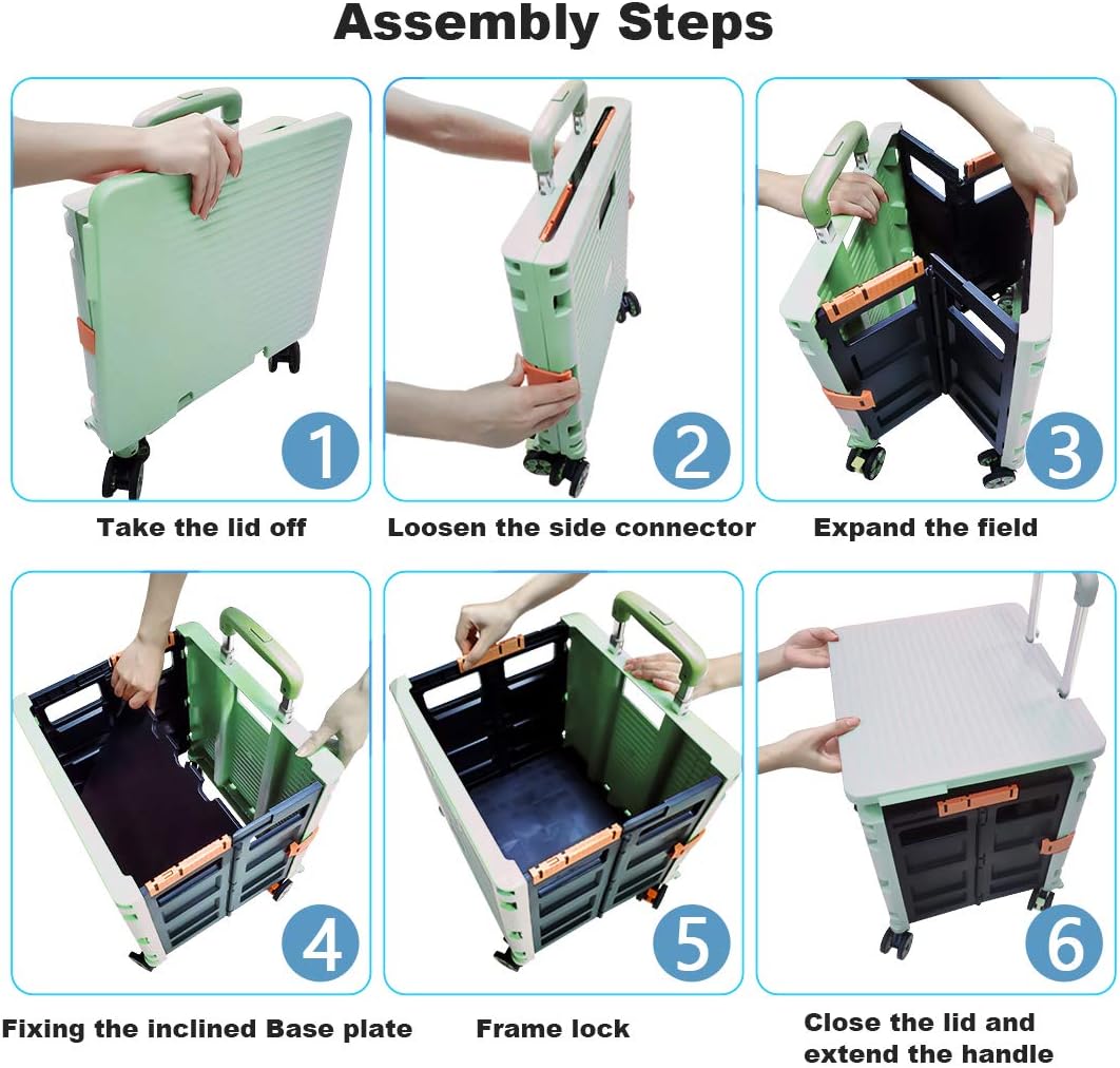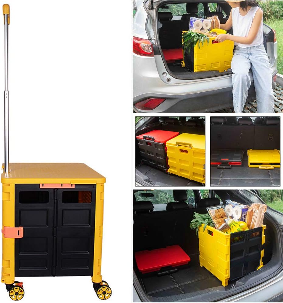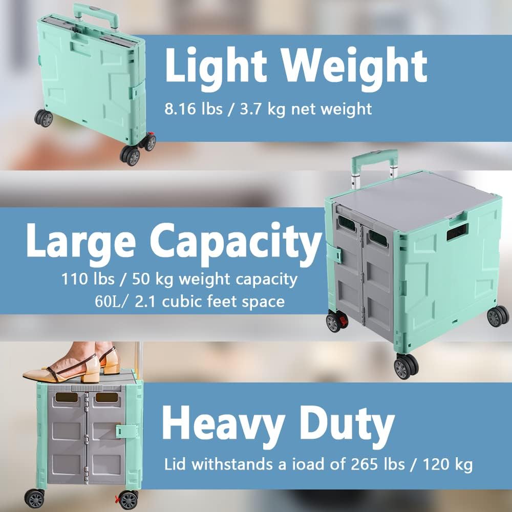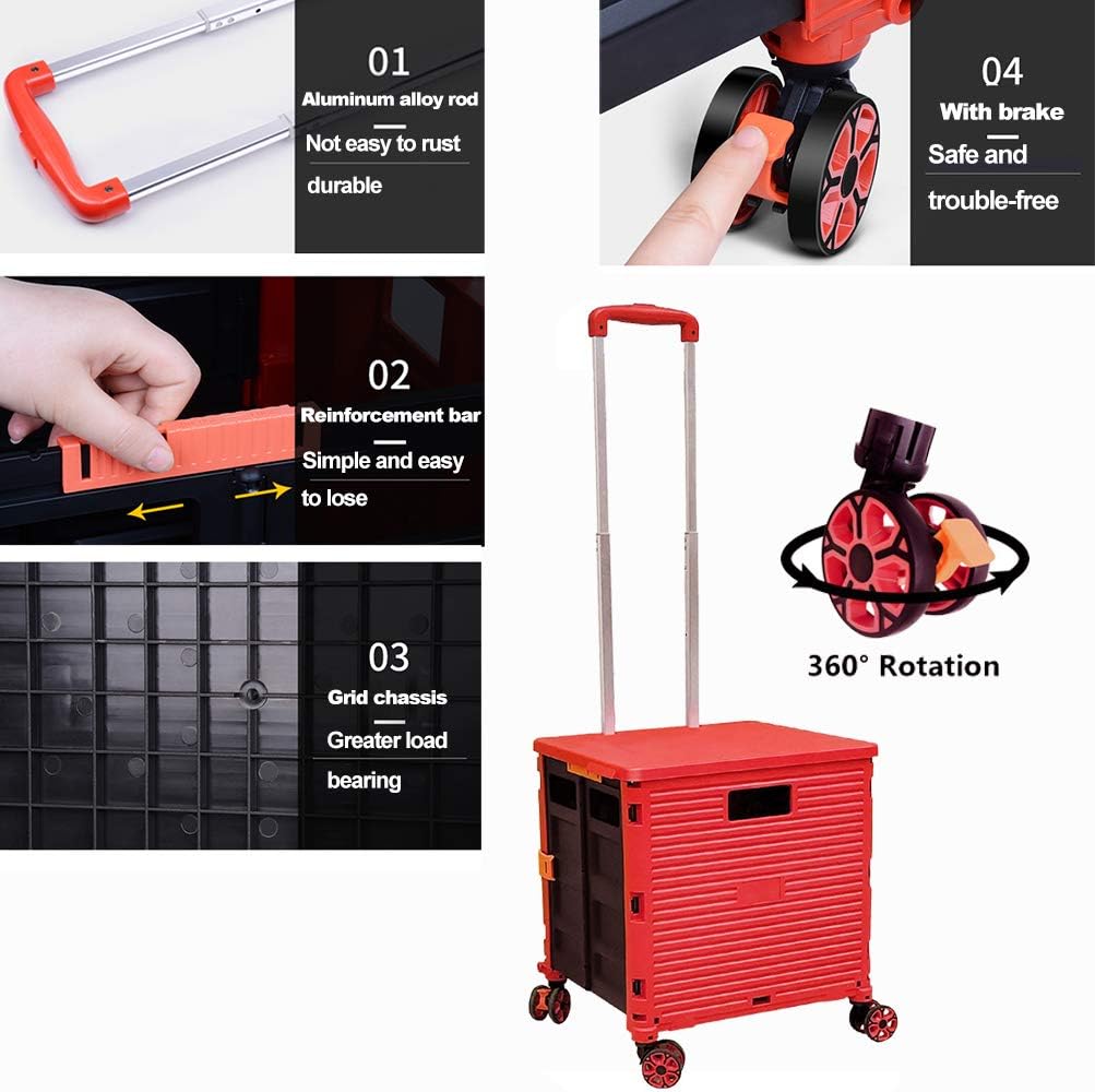 - 【Increíble capacidad de carga y ultra grande】Nuestro carro plegable puede contener 55 L de mercancías, el peso pesado del carro de mano puede alcanzar 175 libras, el peso pesado del mango telescópico de aleación de aluminio a prueba de óxido puede alcanzar 125 libras, según una serie de pruebas prácticas, los carros rodantes tienen un buen rendimiento de carga. Creo que este es un excelente carrito de herramientas para mover comestibles y almacenamiento de libros de oficina, para que nunca tengas que preocuparte por el peso de nuevo.