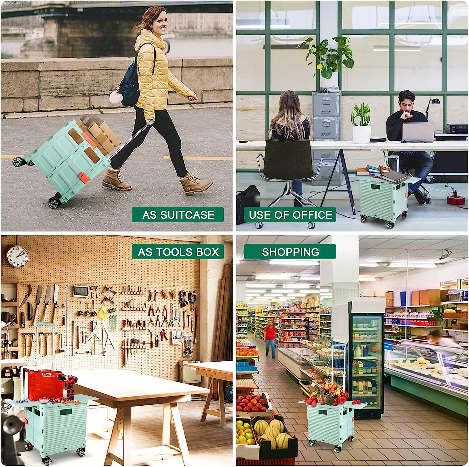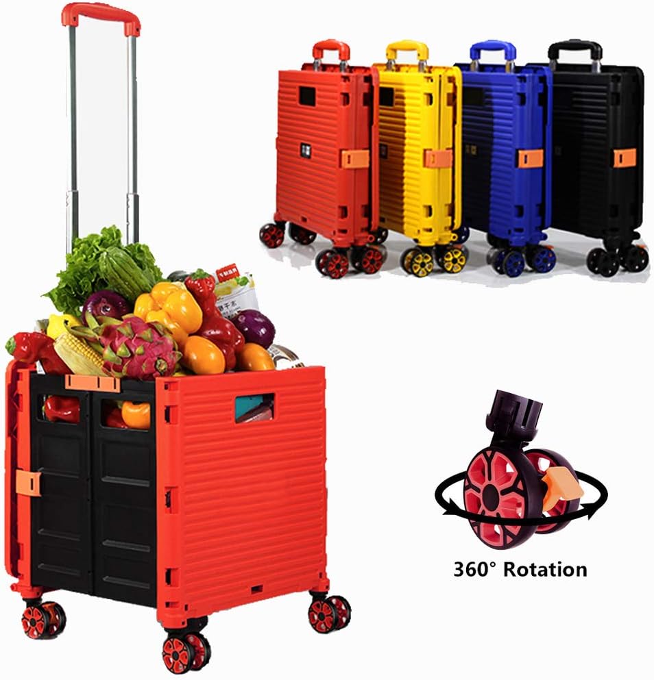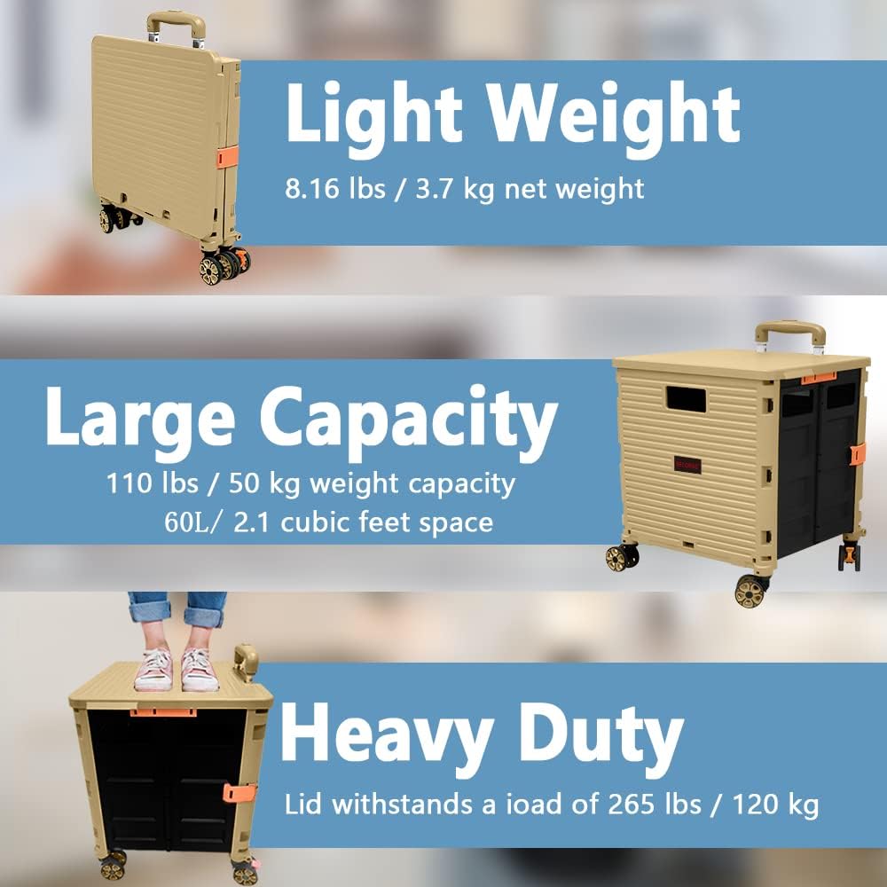 - 【Increíble capacidad de carga y ultra grande】Nuestro carro plegable puede contener 55 L de mercancías, el peso pesado del carro de mano puede alcanzar 175 libras, el peso pesado del mango telescópico de aleación de aluminio a prueba de óxido puede alcanzar 125 libras, según una serie de pruebas prácticas, los carros rodantes tienen un buen rendimiento de carga. Creo que este es un excelente carrito de herramientas para mover comestibles y almacenamiento de libros de oficina, para que nunca tengas que preocuparte por el peso de nuevo.